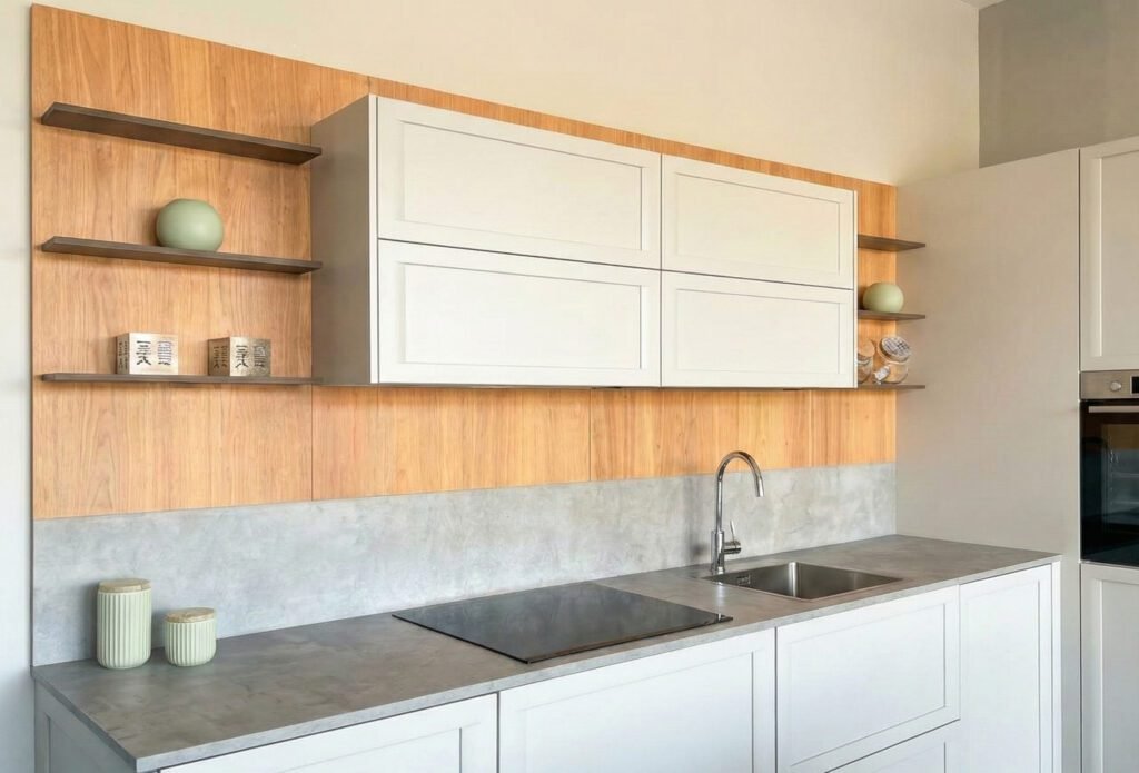 - La scelta del Materiale: Stai attento a dove posizioni la boiserie. Se la metti dietro il lavello o il piano cottura, non usare mai il legno vero (impiallacciato) o i laccati delicati. Il vapore e l’acqua li rovinerebbero in un anno. In quelle zone operative, la pannellatura deve essere realizzata in Laminato HPL, Fenix, Gres o Quarzo. Il legno massello o cannettato va riservato alle zone pranzo o alle pareti laterali, lontane dai pericoli.