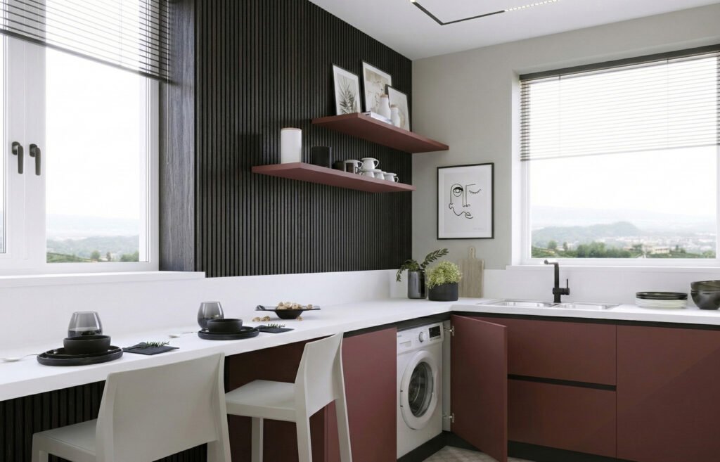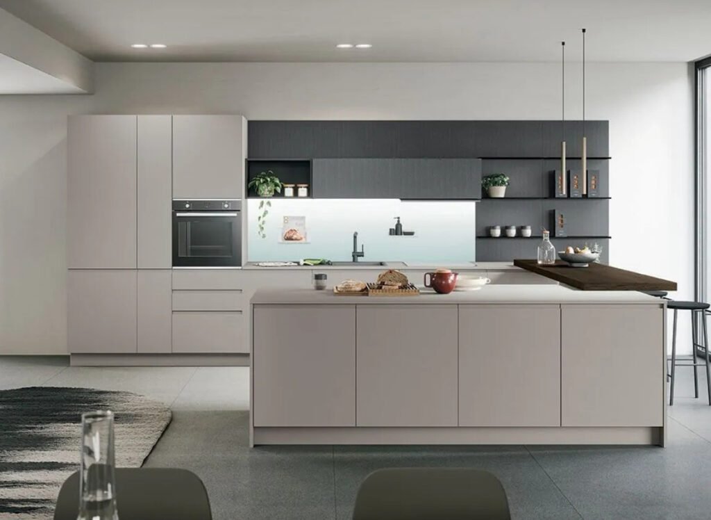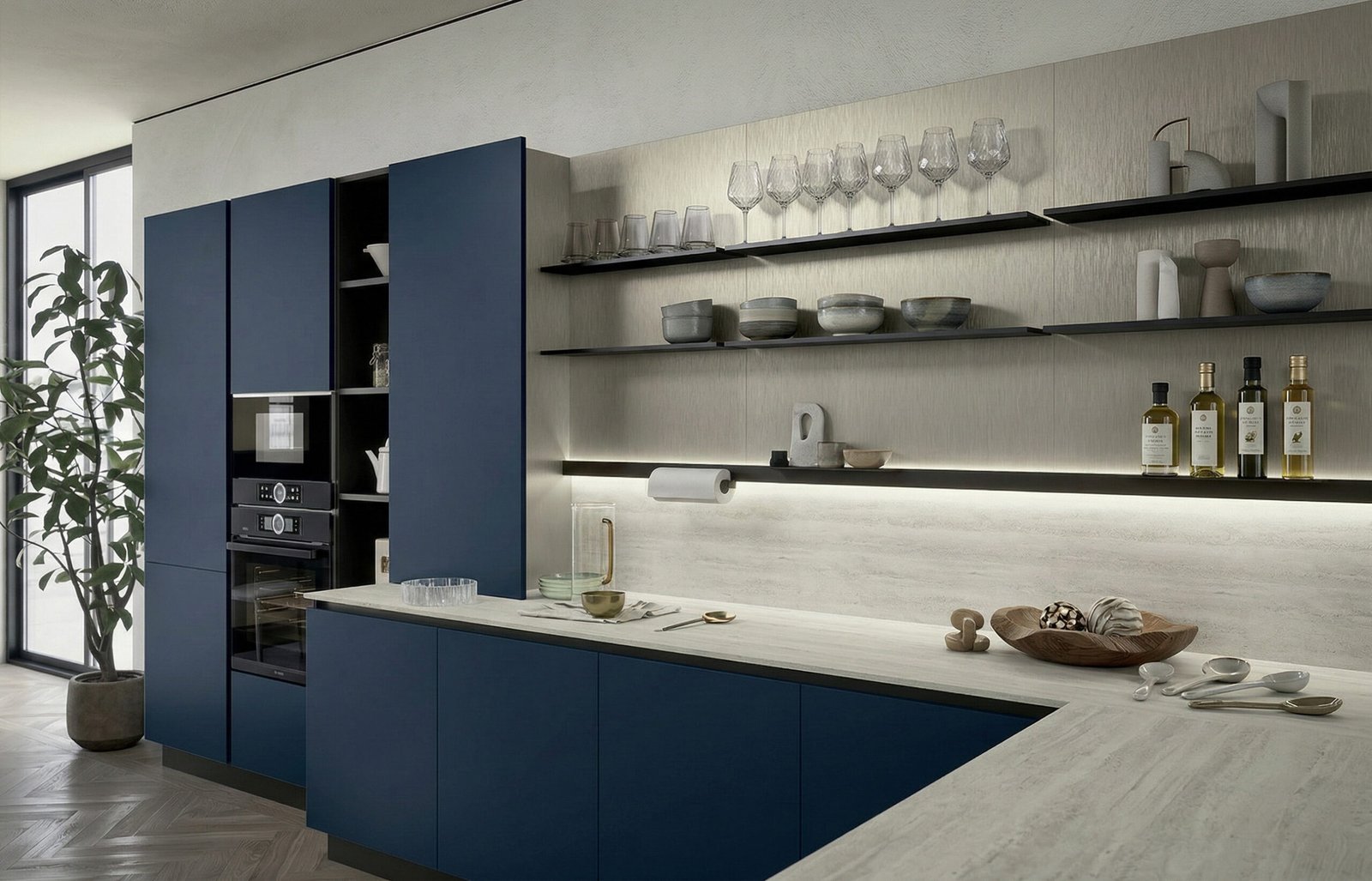 - Come arreda: Funge da vero e proprio “sfondo teatrale”. Su questo grande foglio continuo vengono ancorati direttamente i pensili, le cappe a vista o delle mensole fisse.