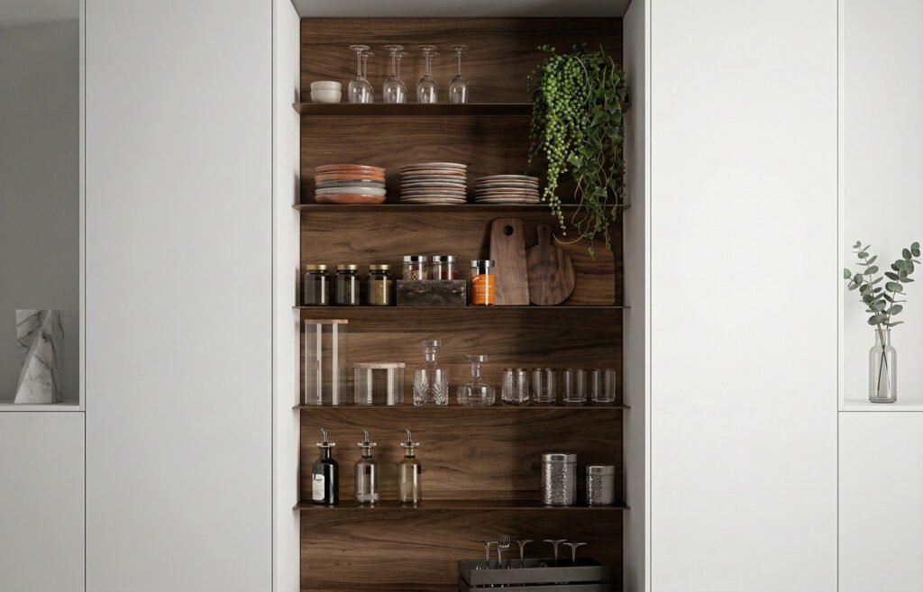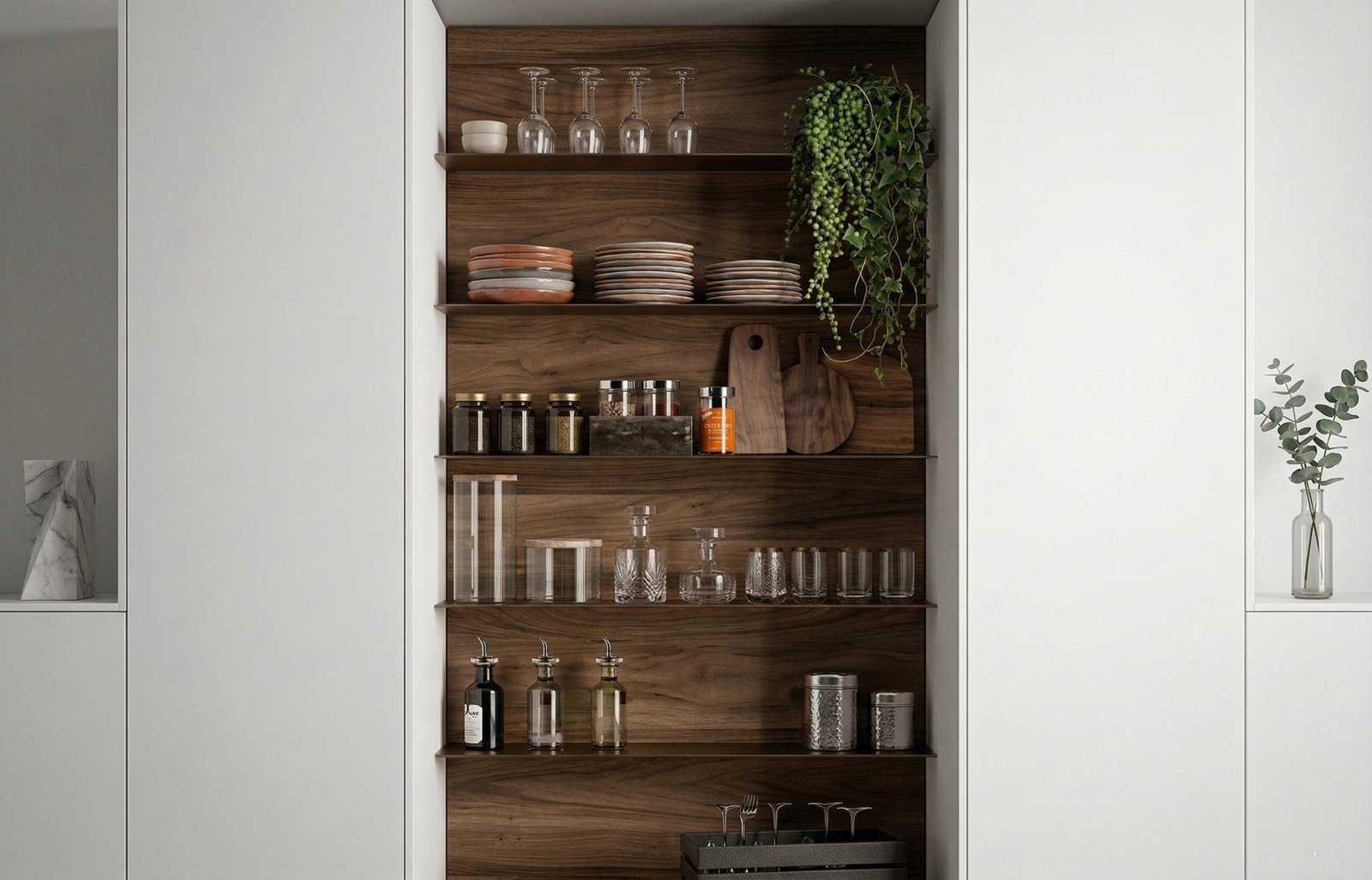 - Come arreda: All’interno di queste fessure vengono inserite a incastro delle mensole ultrasottili (spesso in metallo o in vetro). La mensola entra nel pannello e si blocca da sola, senza bisogno di reggimensole visibili.