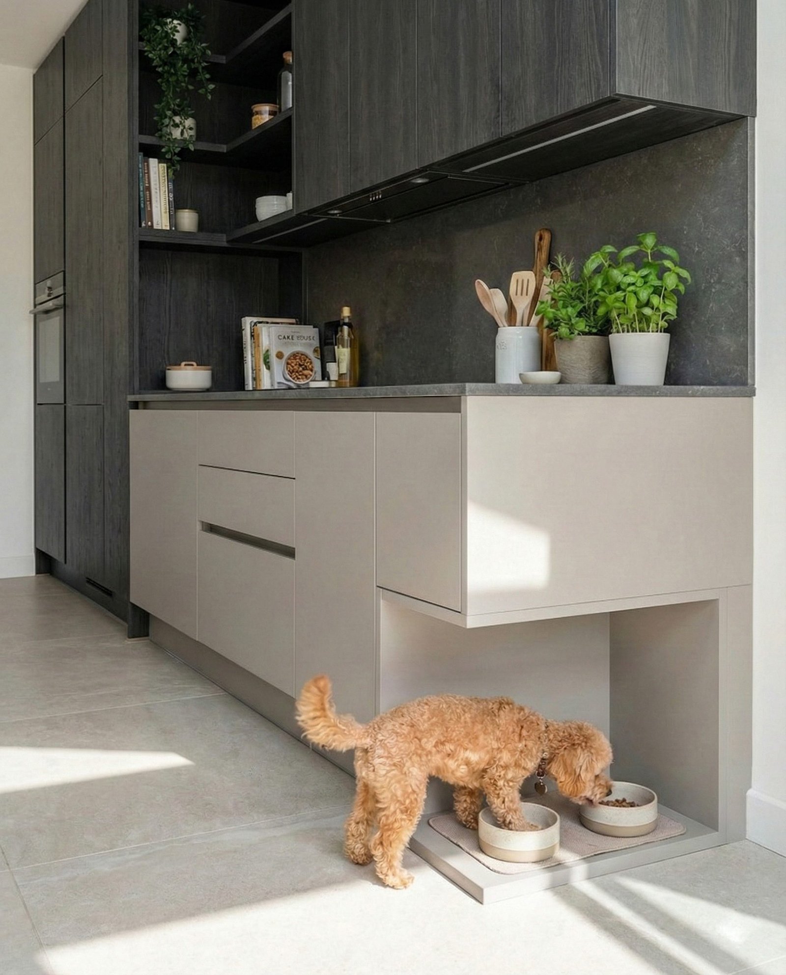 Le ciotole in mezzo alla cucina sono un ostacolo classico. Possiamo progettare vani a giorno bassi (una nicchia nella parte terminale dell’isola o della cucina) dove le ciotole hanno il loro “posto fisso”, riparato dal passaggio. Meno acqua per terra, meno rischi di inciampare.