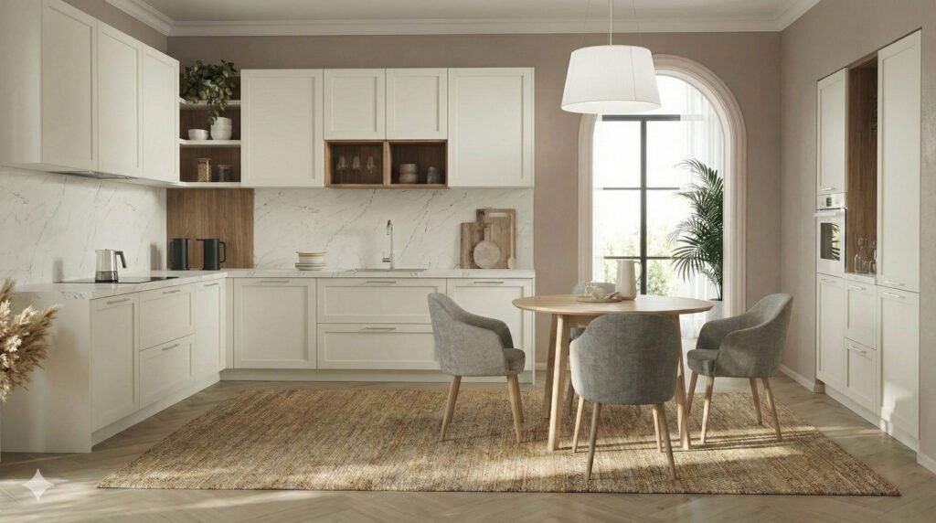 A Firenze, molti appartamenti (specialmente in centro storico) non godono di grandi vetrate o hanno soffitti bassi/travi scure che assorbono luce. Il bianco è un “moltiplicatore di luce” naturale. Riflette ogni raggio che entra dalla finestra, rendendo l’ambiente immediatamente più arioso e visivamente più grande. (Se hai una cucina dalla metratura ridotta, il bianco è quasi un obbligo: leggi i nostri consigli su [🔗 LINK: Arredare una cucina piccola: 10 soluzioni salvaspazio]).