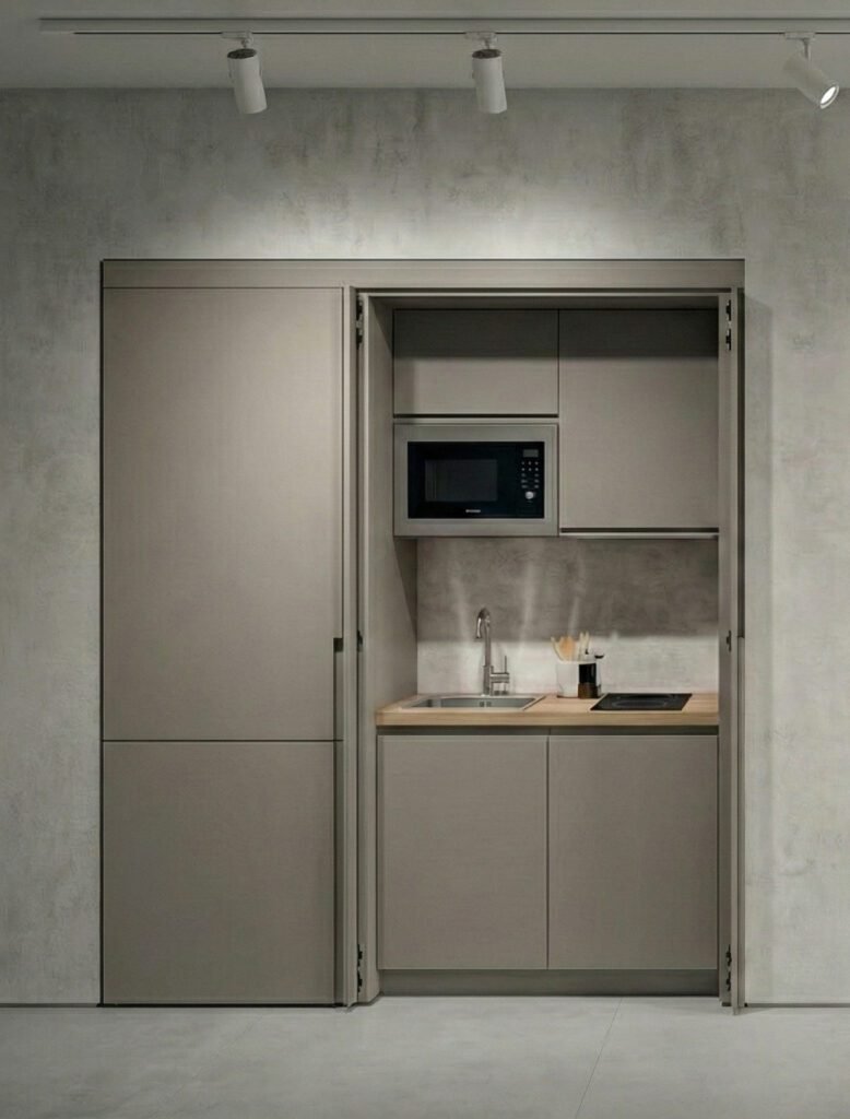 In questi casi, al Centro Cucine Firenze progettiamo Cucine Armadio (a scomparsa). Sembrano normali armadiature da ufficio, ma aprendo le ante a pacchetto o rientranti, svelano l’intera zona cucina (lavello, scolapiatti, frigo). Finito il pranzo, chiudi le ante e l’ufficio torna a essere una sala riunioni immacolata e formale.