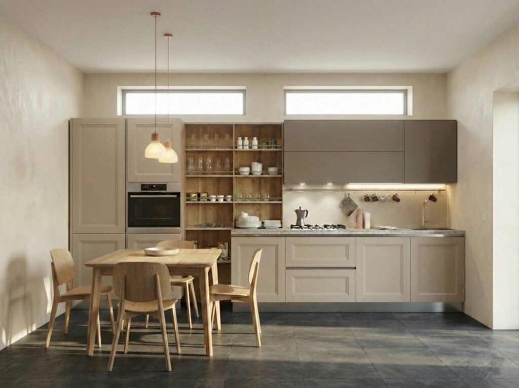 Il nostro consiglio di stile: Usa i toni del legno scuro per il tavolo o le travi, ma fai la cucina chiara. Con i modelli Ada o Brera in tonalità Crema, Panna, Grigio Perla o Legno Sbiancato, porti luce nell’ambiente. Il contrasto tra la cucina chiara e il pavimento in cotto o i muri in pietra è la scelta estetica più vincente: allarga lo spazio e rende la stanza vivibile anche di giorno.