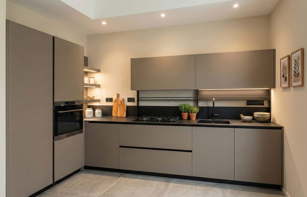 La scelta estetica: Meno pensili, più respiro. Le clienti, una madre con la figlia laureanda, avevano un desiderio preciso: evitare l’effetto “blocco” tipico delle cucine troppo piene. Avendo esigenze diverse da una famiglia numerosa, hanno scelto di sacrificare il contenimento a favore dell’estetica. Abbiamo quindi ridotto al minimo i pensili, lasciando le pareti libere e trasformando la cucina in un ambiente living arioso e raffinato, perfetto per ospitare anche stampe e decorazioni.