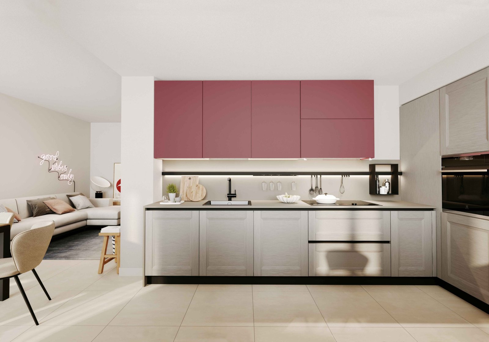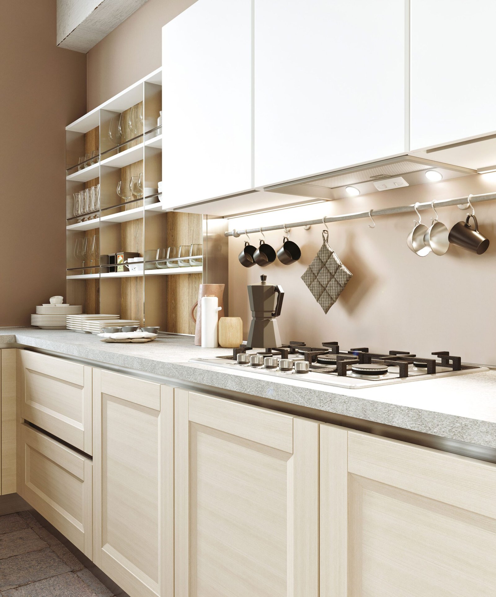 Geometrie rigorose e tinte neutre di tendenza per una cucina contemporanea e accogliente: la sua anta “a telaio” di gusto classico si sposa perfettamente con il più moderno design delle cucine attuali. Può essere realizzata “con maniglia”, scegliendo quest’ultima fra le decine disponibili, oppure “con gola”. Una cucina davvero adatta a tutti i tipi di ambienti…