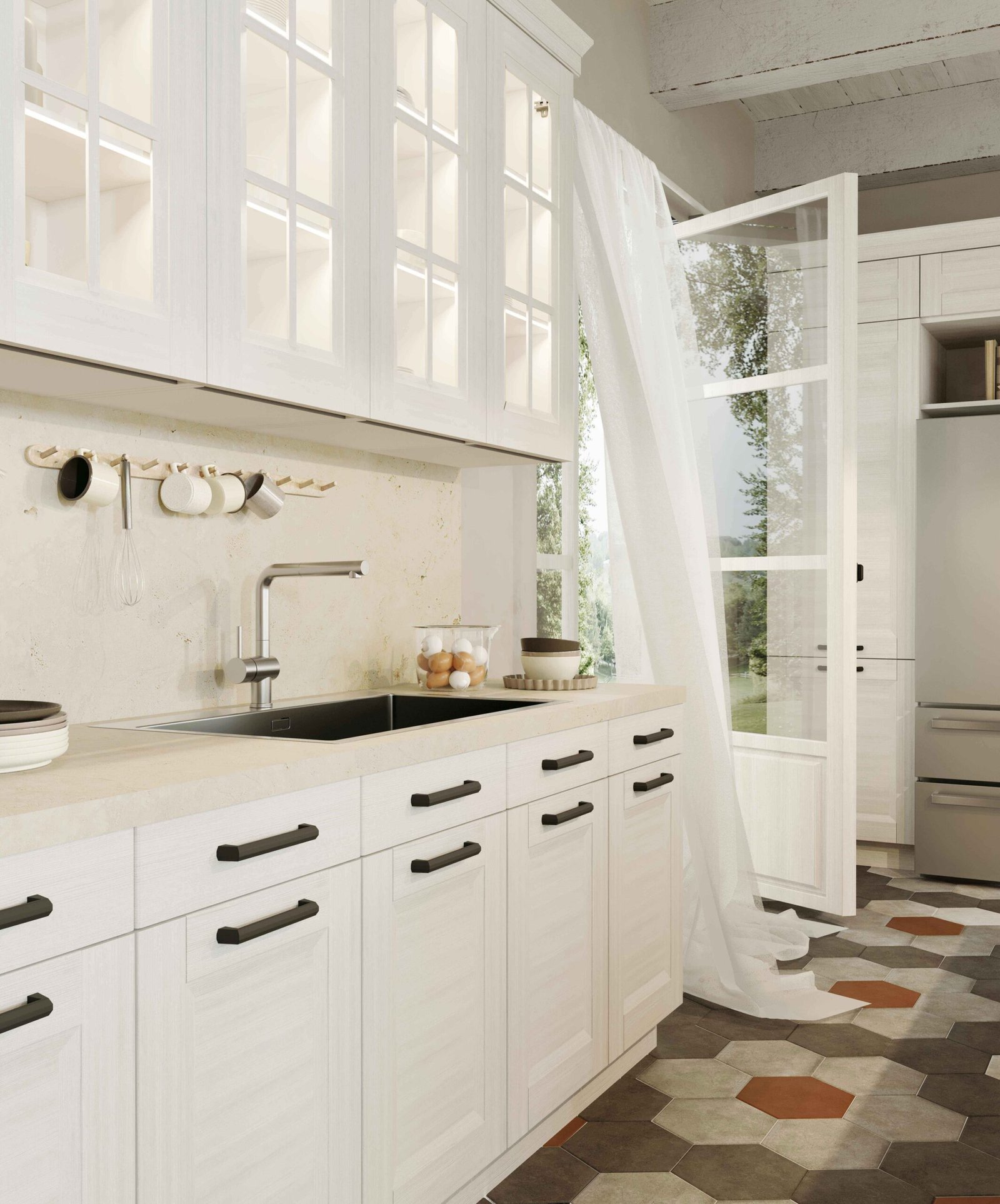Anta a Telaio: Il tratto distintivo è l’anta intelaiata che richiama la tradizione artigianale, ma reinterpretata con linee pulite e geometriche tipiche del gusto contemporaneo.