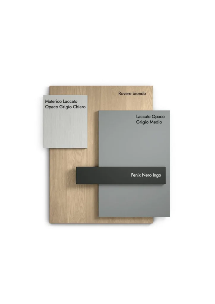 Palette Cromatica: È disponibile in tonalità eleganti che spaziano dal bianco luminoso per composizioni lineari, fino a combinazioni bicolore più audaci, come il grigio fumo abbinato a pensili in verde bosco.