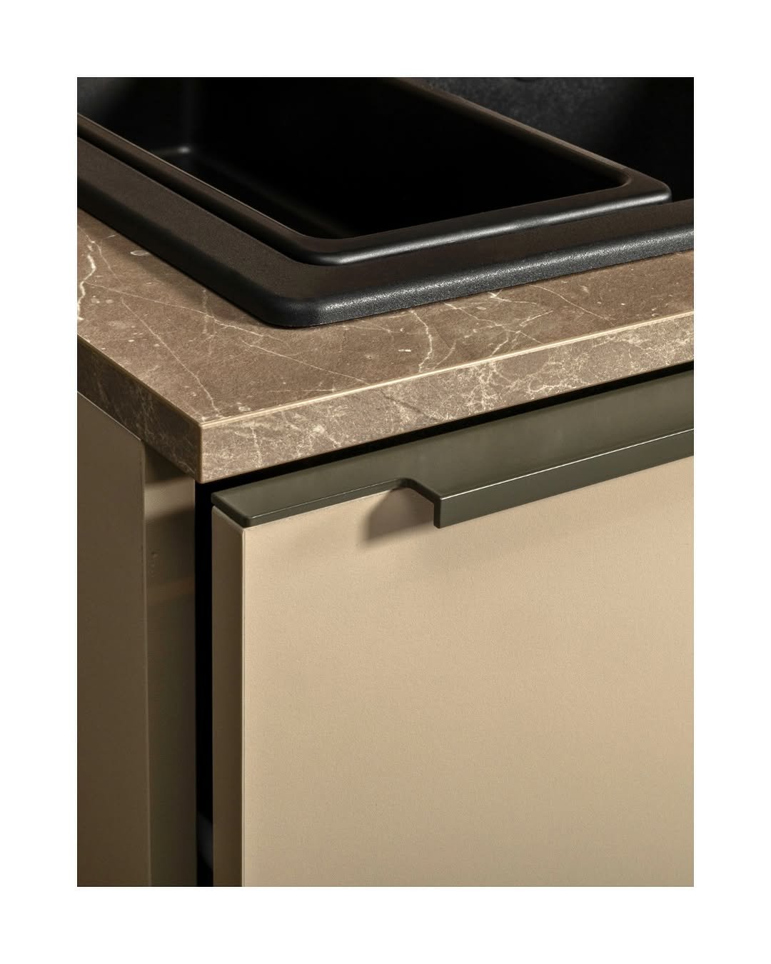 I Piani di Lavoro (Top): La libertà continua sulla superficie di lavoro. È possibile coordinare il top alle ante per un effetto monolitico o giocare con i contrasti, scegliendo tra superfici tecniche ad alta resistenza, effetti pietra naturale, quarzi luminosi o laminati materici che riproducono fedelmente ogni venatura.