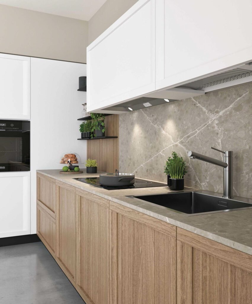 - L’impatto estetico: La cappa scompare letteralmente all’interno di un pensile. Dall’esterno, vedrai solo un’anta continua e allineata a tutte le altre. Questa scelta alleggerisce enormemente il design della stanza, facendola sembrare più ampia, ordinata e moderna. È la soluzione prediletta nei progetti di lusso dalle linee ultra-pulite.