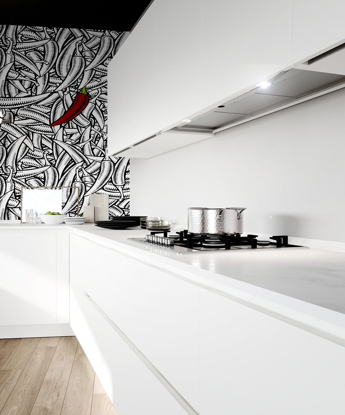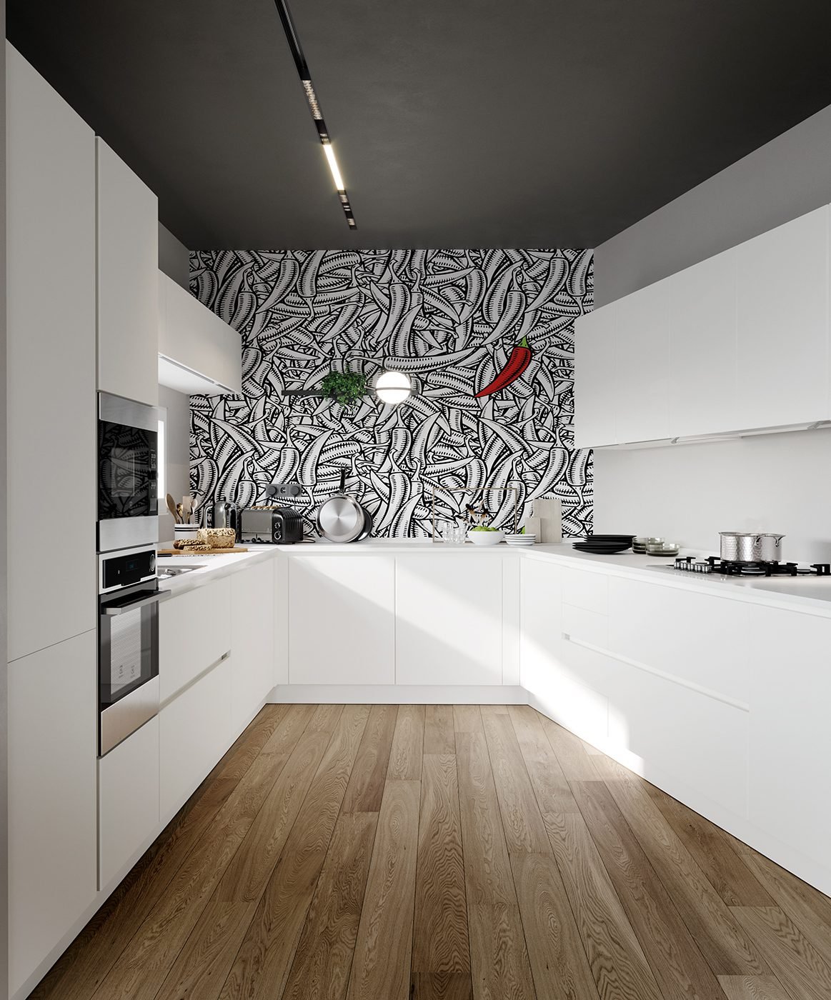 La cucina Sistematica in questa configurazione diventa un organismo architettonico che abbraccia l’ambiente. La scelta del bianco assoluto dilata la percezione dello spazio, mentre la precisione delle lavorazioni su misura trasforma un ambiente dalla planimetria complessa in un capolavoro di funzionalità ed eleganza.