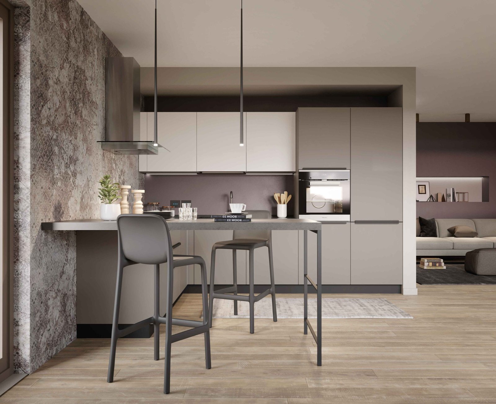 Il Cromatismo: Armonia Bicolore La composizione gioca sapientemente su un dualismo cromatico raffinato. I pensili superiori si staccano visivamente dalle basi e dalle colonne grazie a una tonalità più chiara e luminosa, creando un ritmo visivo che alleggerisce la percezione dei volumi. Questo abbinamento di colori neutri e caldi (toni del tortora e del grigio/bianco caldo) rende la cucina accogliente e perfettamente integrabile con la zona living.