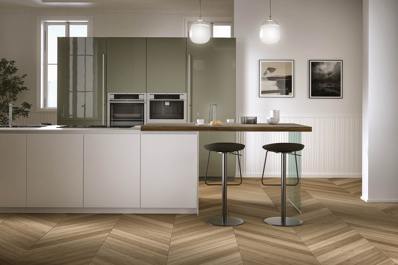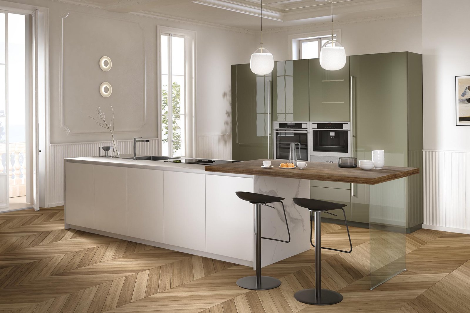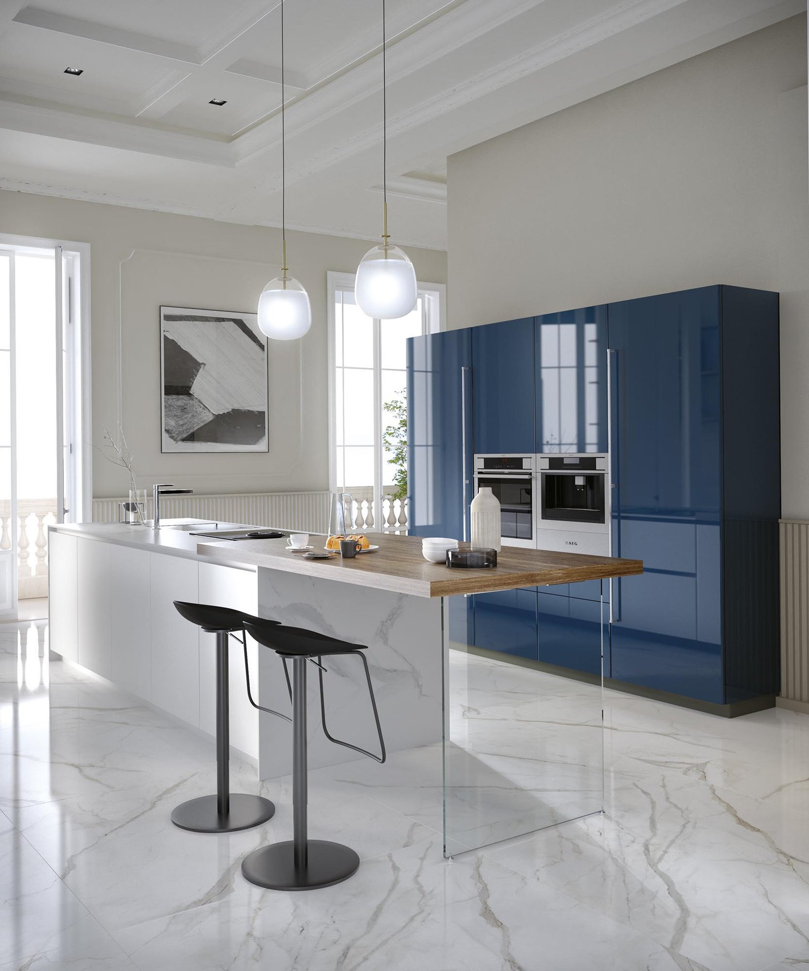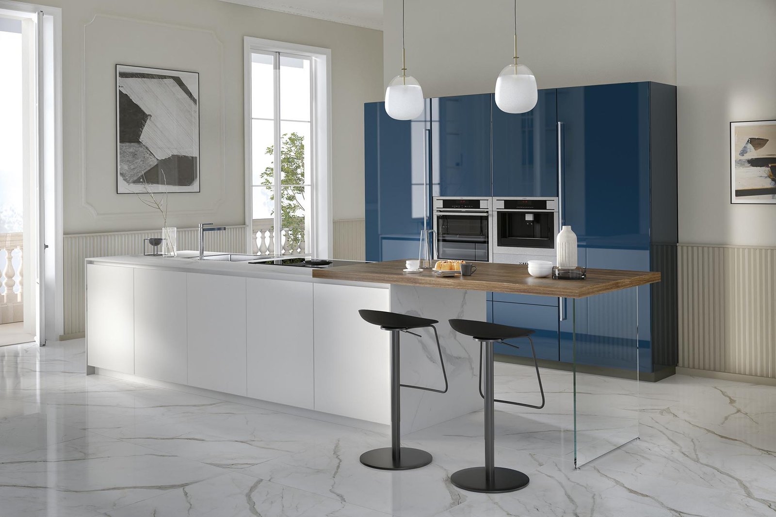 Cucina a isola dal design elegante e contemporaneo, perfetta per chi cerca stile e funzionalità in un unico ambiente. Le basi in PET bianco seta con apertura a gola e il top in laminato creano linee pulite e raffinate, mentre il piano snack effetto legno con gamba in vetro trasparente aggiunge un tocco di leggerezza e originalità. Gli zoccoli bianchi mantengono l’armonia delle forme, mentre le colonne laccate lucide blu, complete di colonna frigo e dispensa da 75 cm, donano carattere e personalità. I maniglioni in finitura acciaio e gli zoccoli in grigio lavagna completano la composizione con un dettaglio moderno. Inclusi nel kit: elettrodomestici con frigo da 75 cm, lavello e miscelatore. Sono esclusi cappa, secondo forno e accessori. La cucina è disponibile su progetto e personalizzabile in numerose finiture, per dare vita a uno spazio unico e su misura.