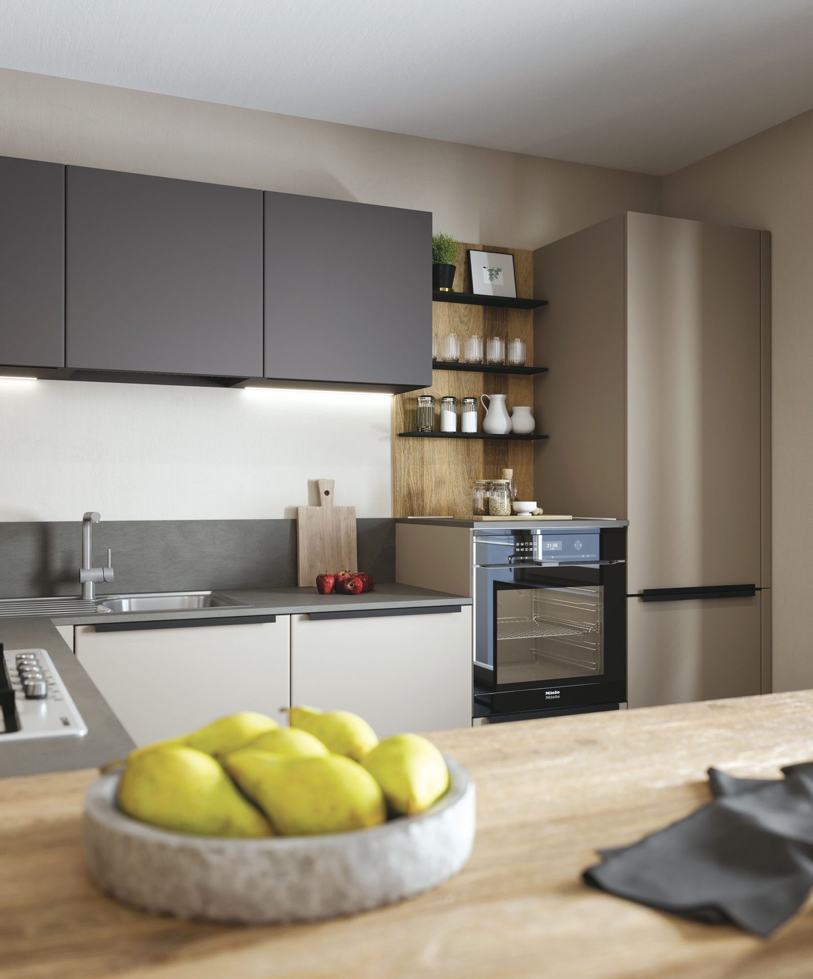 Cucina a penisola dal design elegante e contemporaneo, con basi e colonne in nobilitato grigio scuro e pensili in laccato opaco monofacciale coordinato. Le maniglie integrate in metallo nero sottolineano le linee pulite della composizione, mentre top e schienale in laminato grigio creano un effetto raffinato e uniforme. Il piano snack in laminato effetto legno, sorretto da una gamba in metallo nero supermatt, aggiunge un tocco di calore e modernità. Completa l’ambiente la presenza di due boiserie con pannelli in nobilitato effetto legno e mensole in HPL nero opaco, ideali per organizzare e decorare lo spazio con stile. Inclusi nel kit: elettrodomestici, lavello e miscelatore. Sono esclusi cappa e accessori. Disponibile su progetto e personalizzabile in numerose finiture per adattarsi perfettamente al tuo stile.