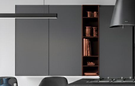 Gli Elettrodomestici Integrati: I forni e gli elettrodomestici sono incassati a colonna, seguendo una linea verticale che massimizza l’efficienza senza interrompere l’armonia estetica. Le ante sono dotate di un vetro scuro che mantiene l’uniformità cromatica, creando un effetto monolitico e sofisticato.