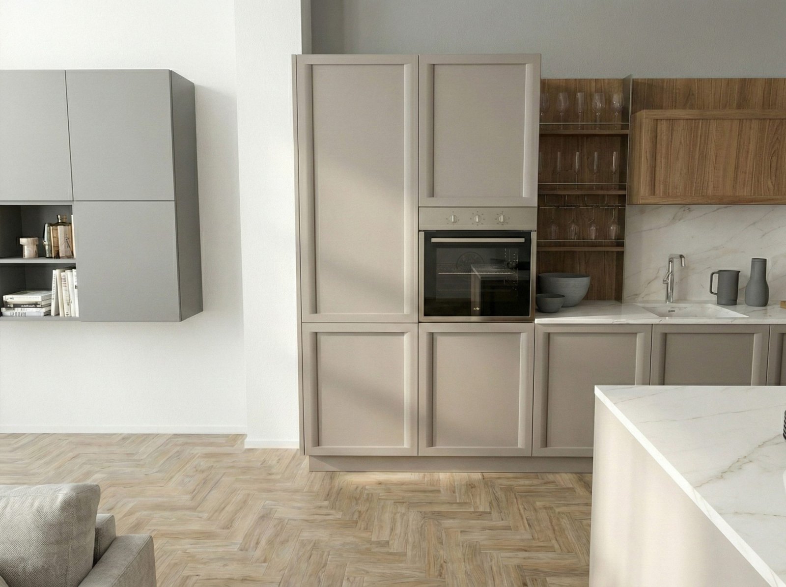 L’Interno che Sorprende: Come in tutte le cucine Brera di alta gamma, la bellezza non si ferma alla superficie. Aprendo le ante color Canapa o il pensile in legno, si scopre una scocca interna in finitura Grigio Orione. Un dettaglio scuro, tecnico e raffinato, pensato per chi apprezza la cura costruttiva anche nelle parti solitamente celate alla vista.