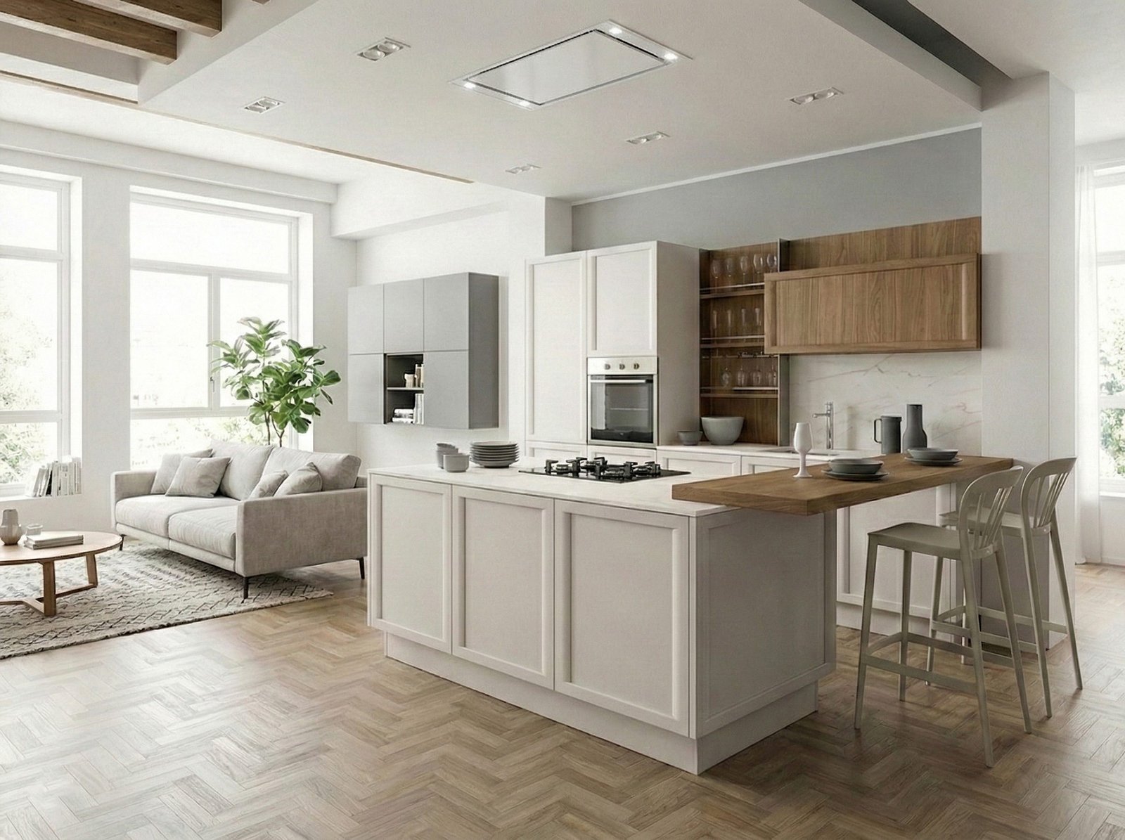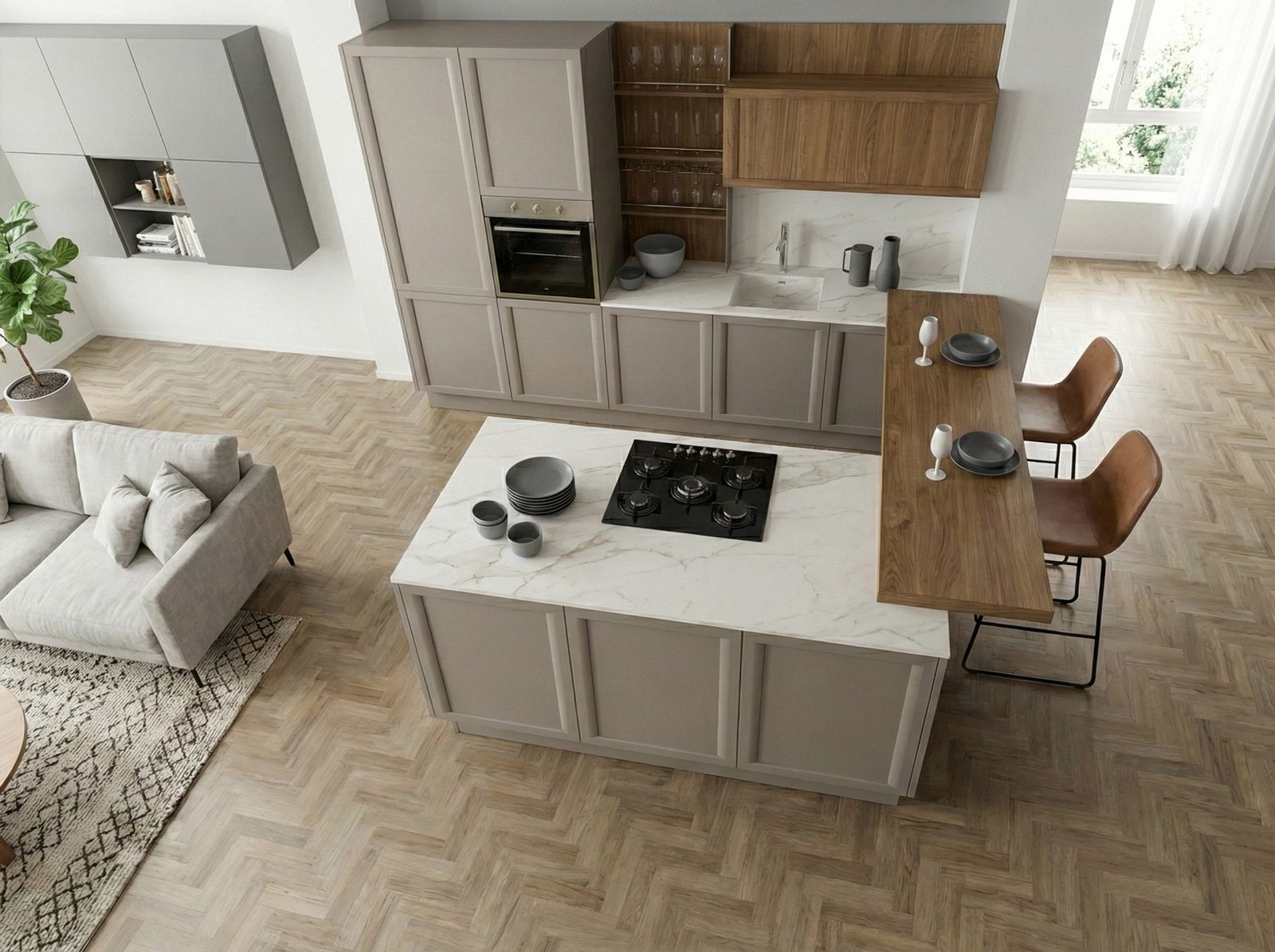 Connessione Funzionale: Crea una continuità operativa tra la zona cottura (sull’isola) e la zona lavaggio (a parete), trasformando due blocchi distinti in un unicum armonico a forma di “L” o di penisola estesa.