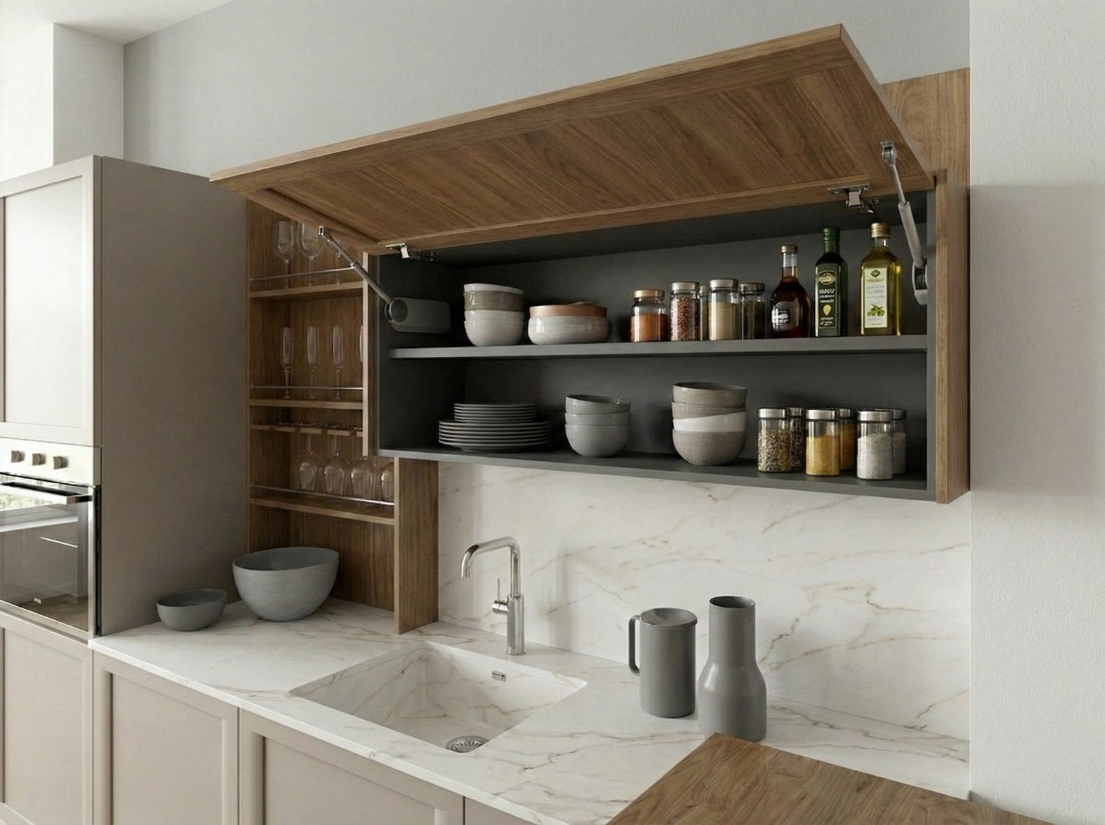 Il Pensile Vasistas: Sopra la zona lavaggio domina un grande pensile in Noce con apertura vasistas verso l’alto. Questo elemento riprende la finitura del piano snack, chiudendo il cerchio cromatico e offrendo un ampio volume di contenimento.