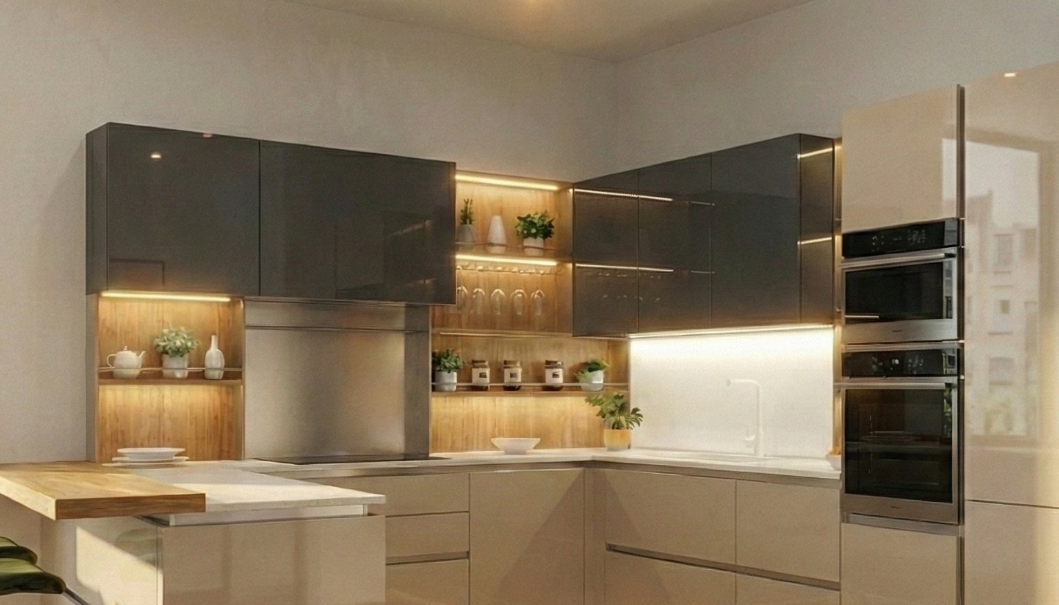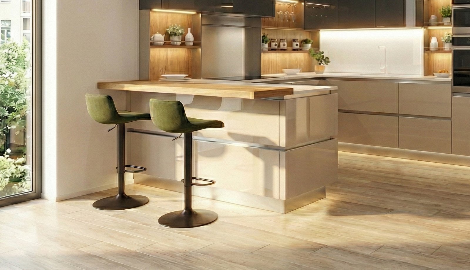 Per ammorbidire il rigore glaciale del vetro lucido e del quarzo, il progetto inserisce tocchi materici caldi e strategici. La composizione è squisitamente ritmata da tre eleganti scaffali a giorno modello Vertigo (due laterali e uno frontale). Questi elementi, dotati di illuminazione LED dedicata, presentano schienali in materico color legno che scaldano immediatamente l’atmosfera. La genialità di questo progetto sta nel richiamo cromatico perfetto: la stessa finitura legno viene utilizzata per la spessa mensola a sbalzo del bancone snack. Questo dettaglio crea un filo conduttore visivo ininterrotto che unisce idealmente la zona operativa all’area living, invitando alla convivialità su comodi sgabelli.