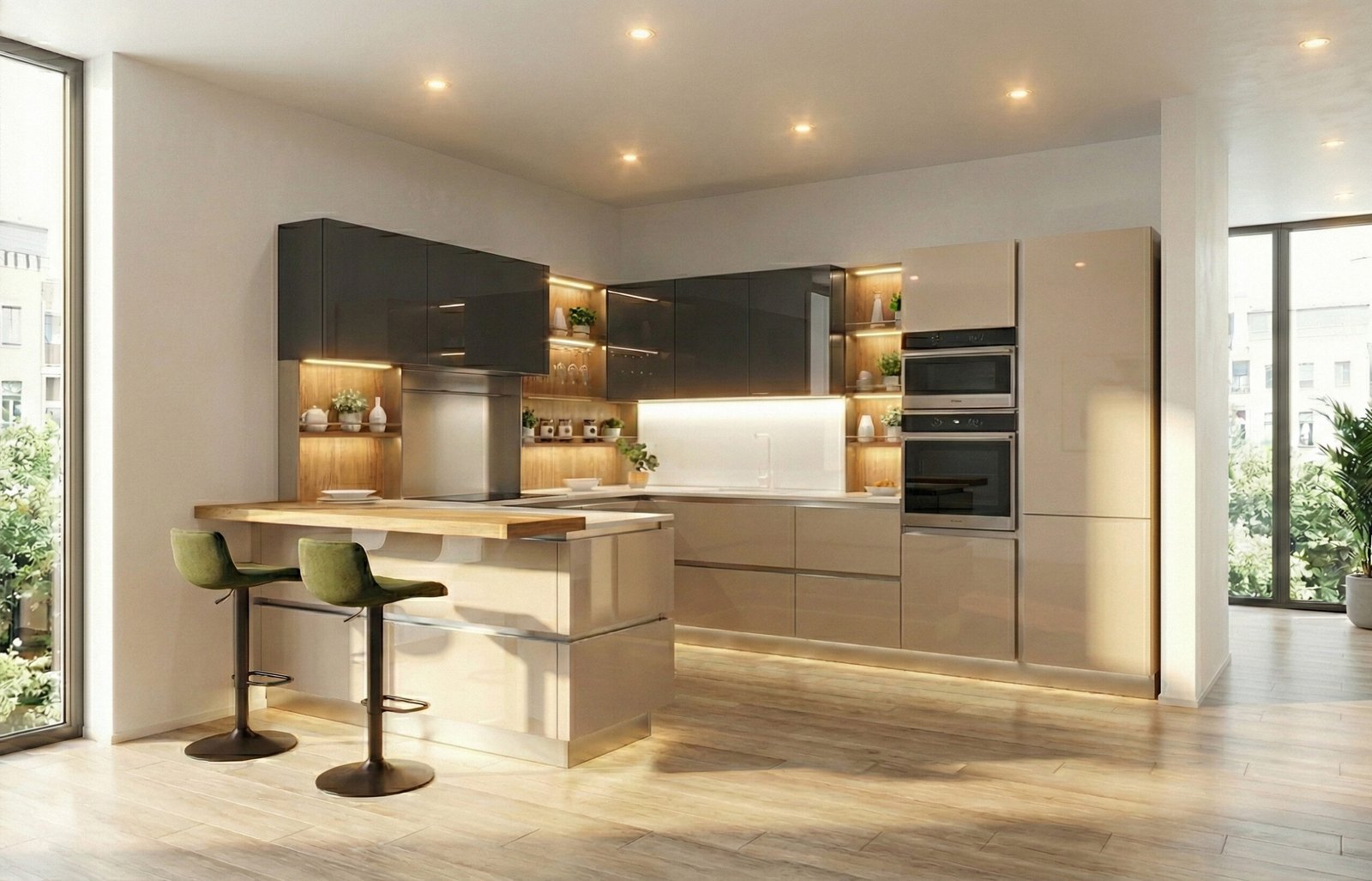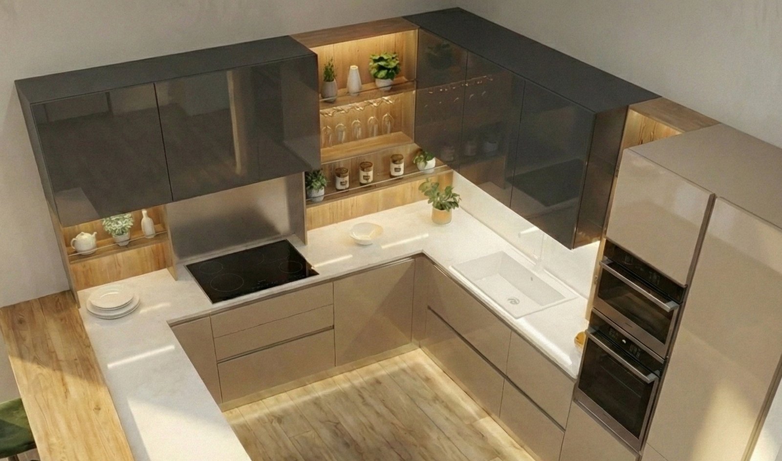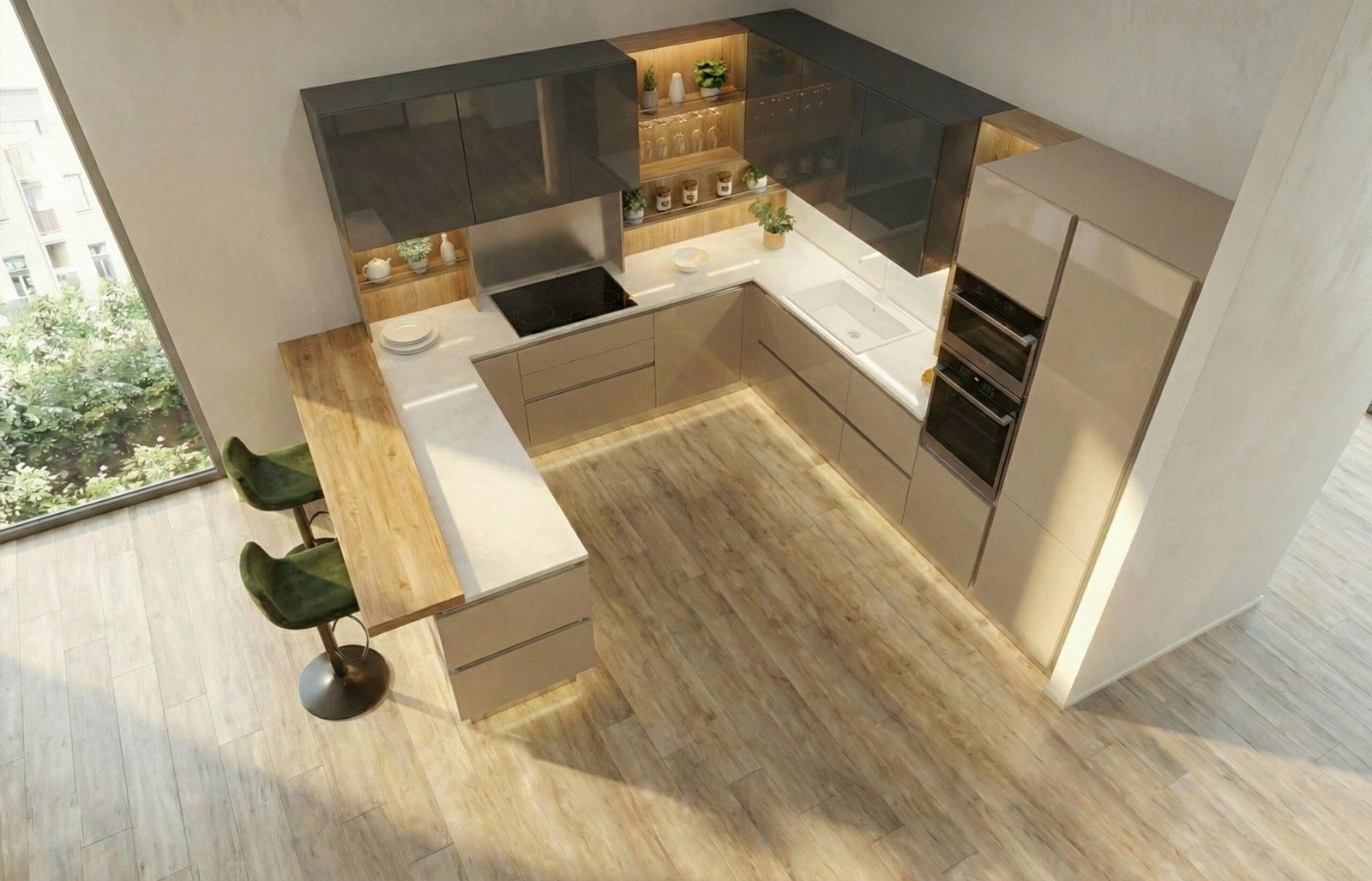 Questa composizione del modello Alu Tab è un capolavoro di riflessi e volumi, un progetto in cui l’eleganza assoluta del vetro incontra soluzioni luminose d’avanguardia. Sviluppata su una pianta avvolgente a penisola, la cucina abbraccia lo spazio offrendo un’ergonomia perfetta e una capacità contenitiva senza compromessi.