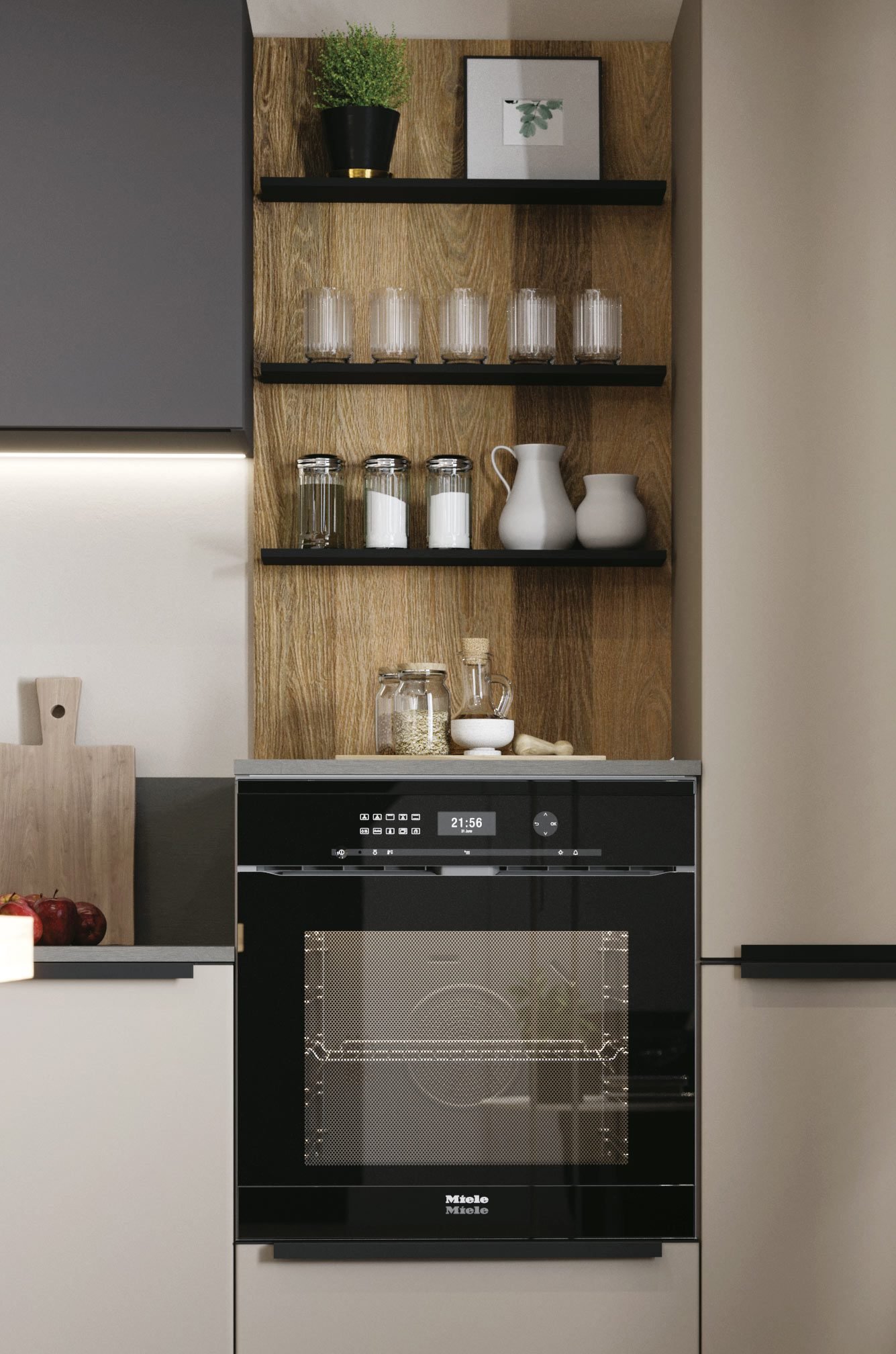 • Colonne Attrezzate: La zona colonne ospita il frigorifero e un modulo dedicato al forno a incasso (modello Miele), posizionato per una massima ergonomia.