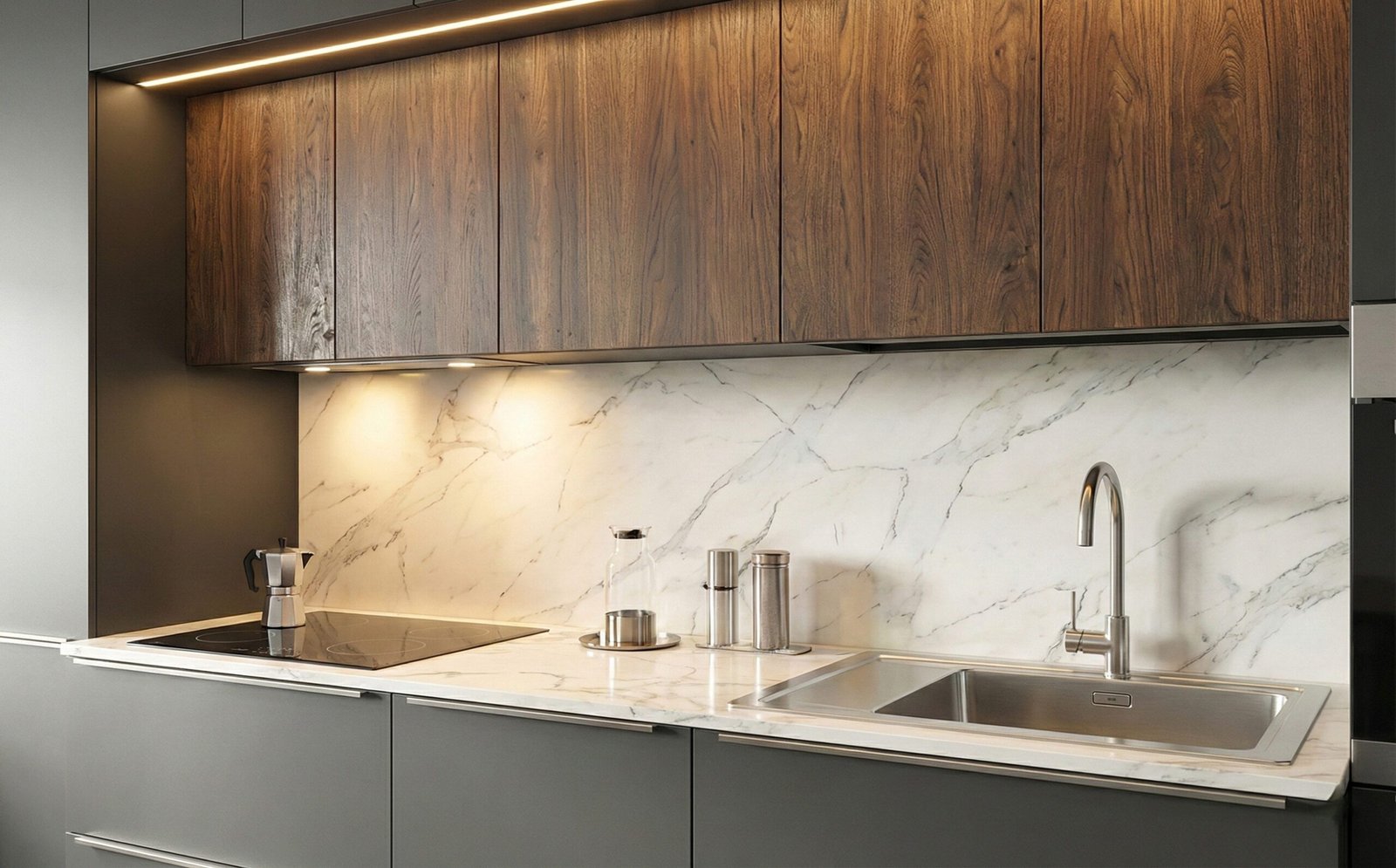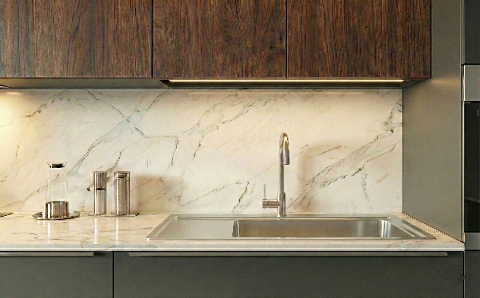 Spessori Importanti: La preziosità del materiale è enfatizzata dalla sua massa: il top di lavoro presenta uno spessore solido di 3 cm, mentre la parete è protetta da un importante schienale paraschizzi (sempre in marmo coordinato) spesso ben 2 cm, garantendo resistenza eterna ed estetica monumentale.