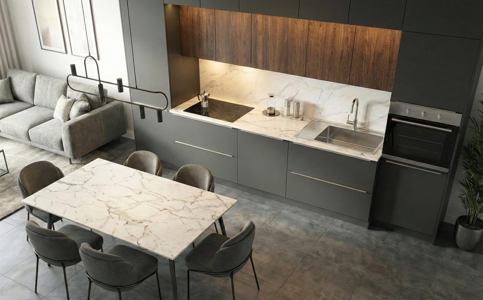 Vero Marmo Calacatta Grigio: Il piano di lavoro non è un semplice rivestimento, ma una lastra di autentico Marmo Calacatta Grigio, caratterizzata da venature naturali irripetibili che rendono la cucina un pezzo unico.