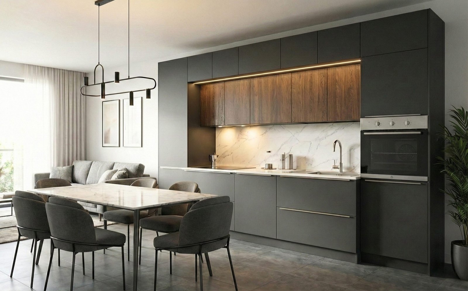 2. Contrasti Materici: Nero Seta e Rovere Artigianale La cucina vive di un dualismo sensoriale che contrappone la tecnologia delle superfici moderne all’autenticità della natura: