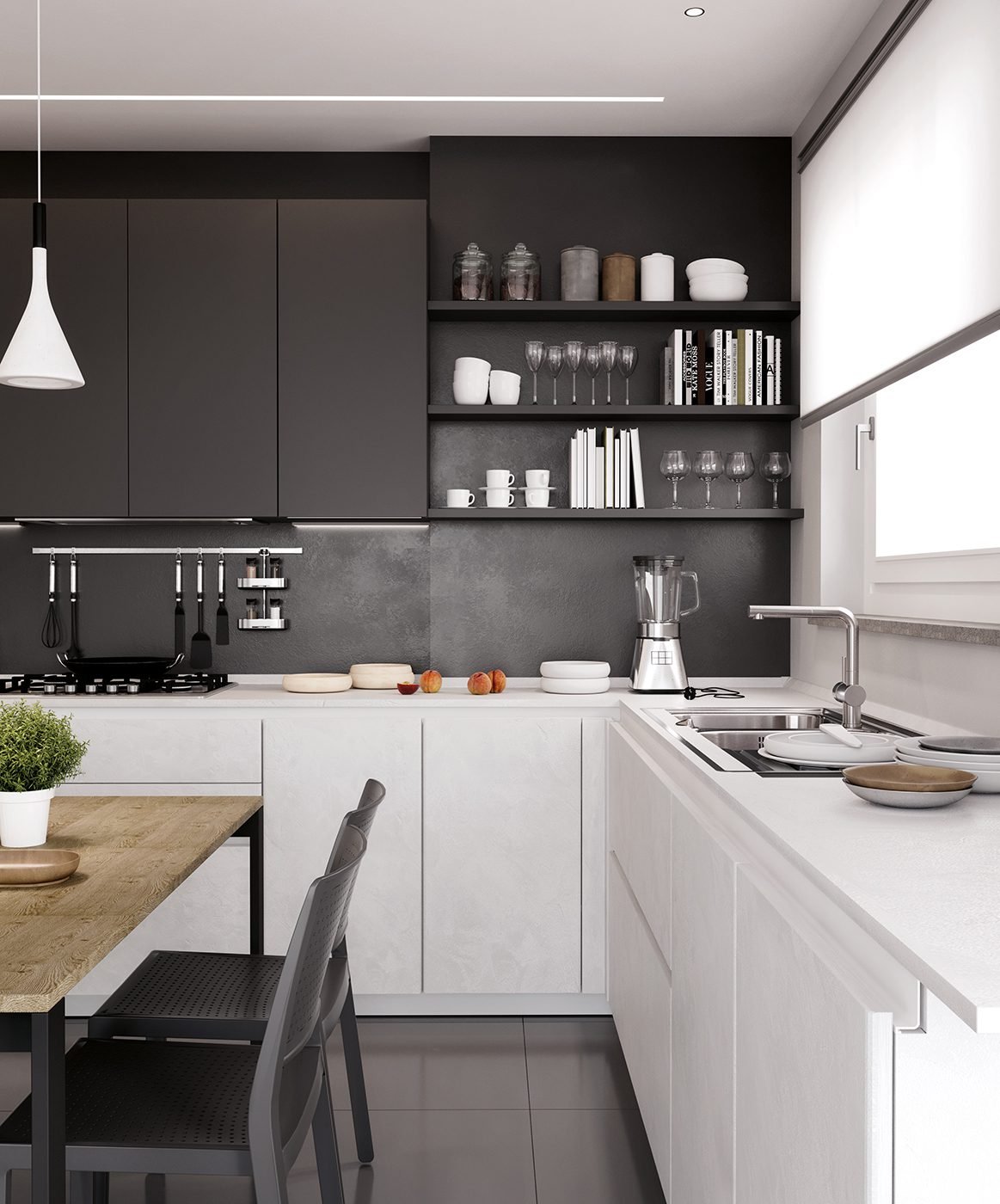 Grigio Antracite: Utilizzato per conferire carattere e solidità alle zone operative o ai volumi predominanti, creando un’ancora visiva forte nello spazio.