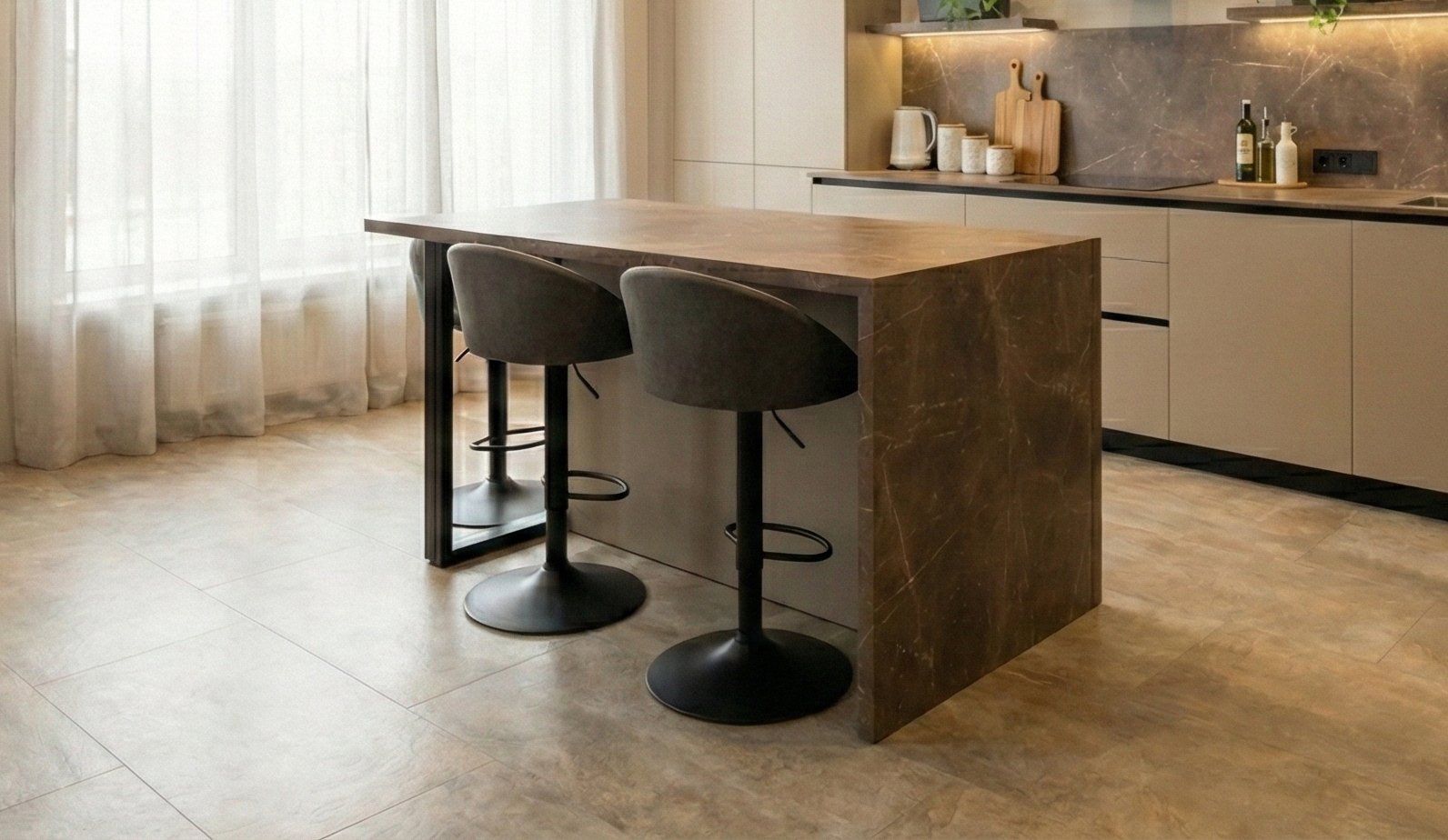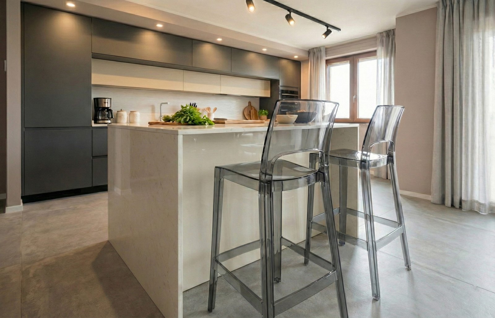 - Larghezza: Calcola almeno 60 cm di larghezza per ogni sgabello. (Esempio: su un’isola da 180 cm ci stanno 3 sgabelli comodi).
